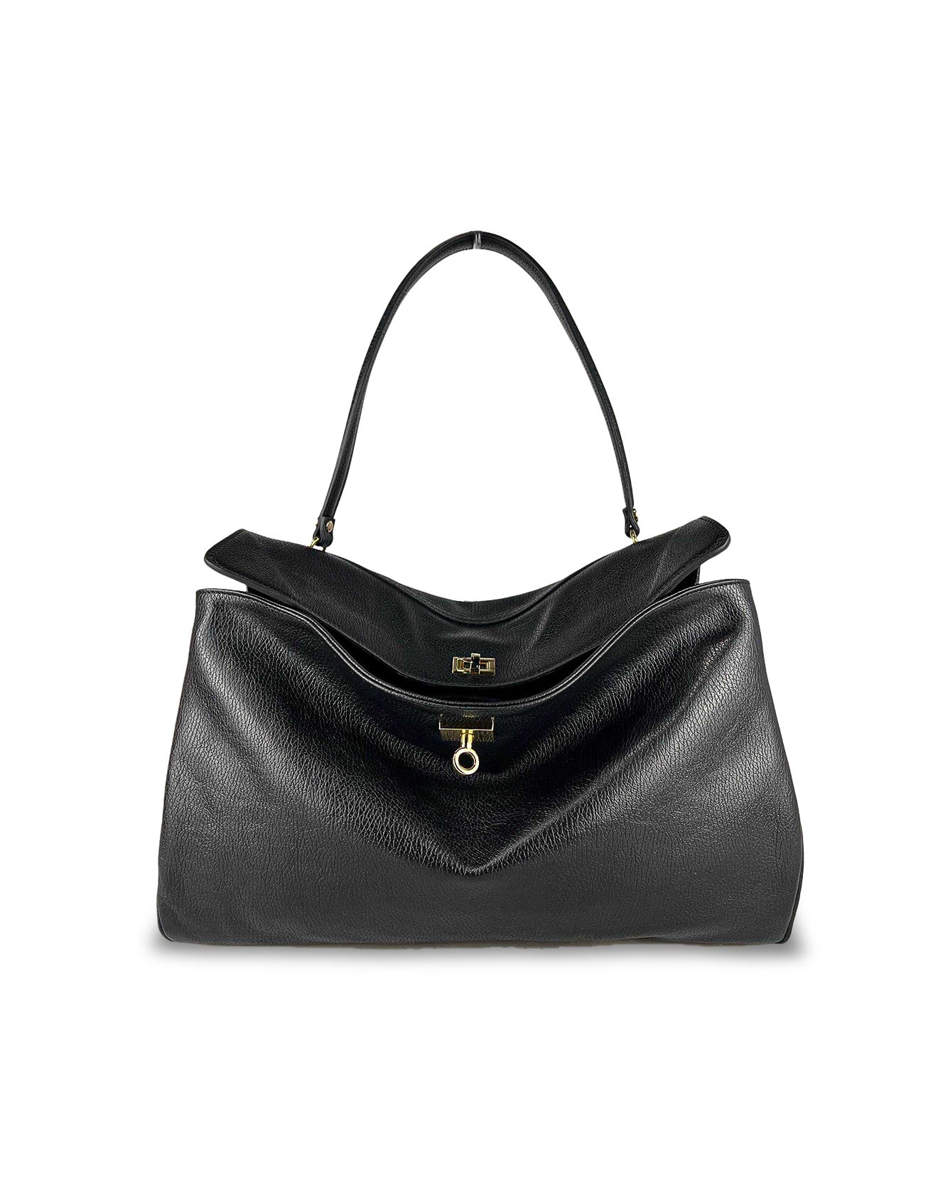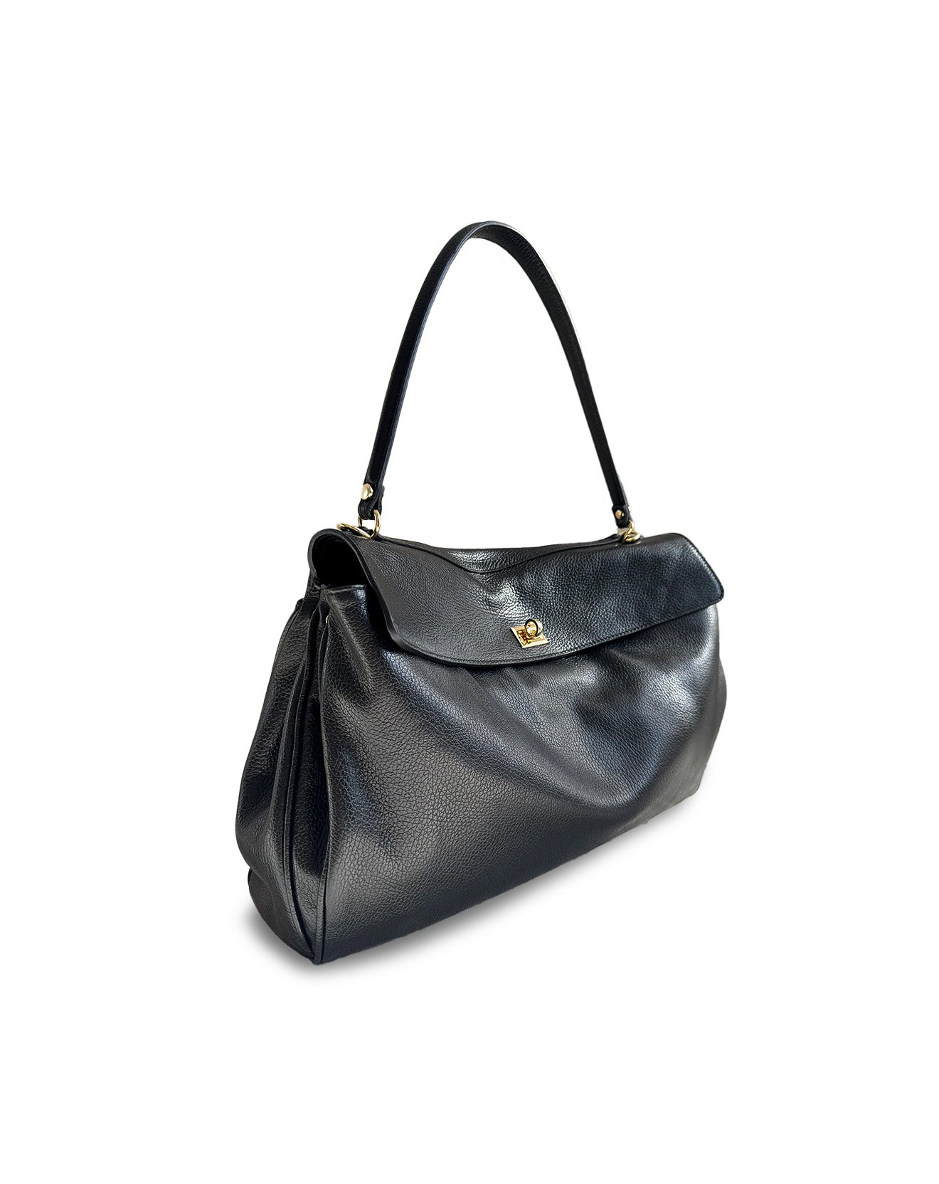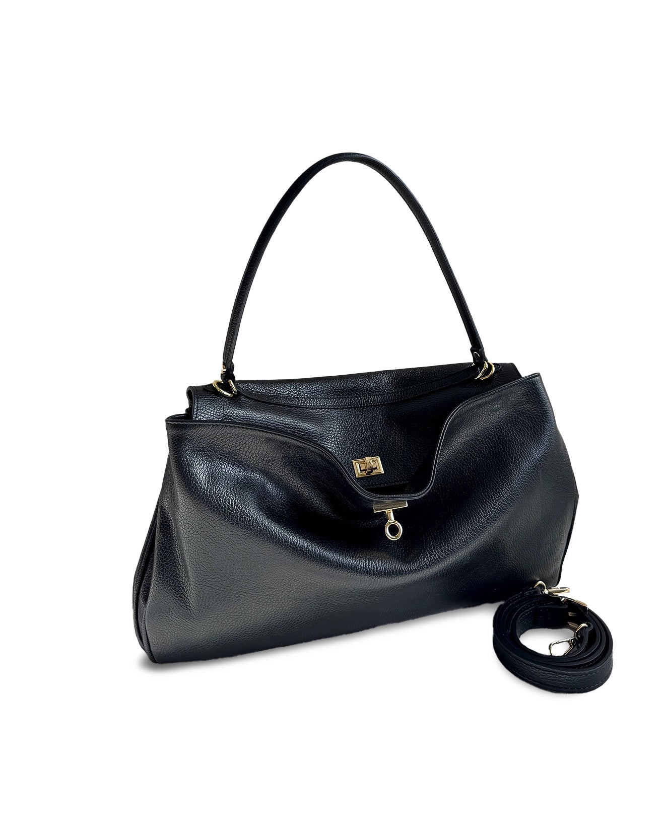 Realizzata in vera pelle martellata italiana, è un pezzo che parla attraverso il tatto, il profumo, la cura dei dettagli. La chiusura dorata è discreta, come tutto ciò che vale davvero. Il manico rigido la rende perfetta da portare a mano o a spalla con naturalezza. L’interno, spazioso e organizzato, segue il ritmo di chi la indossa.