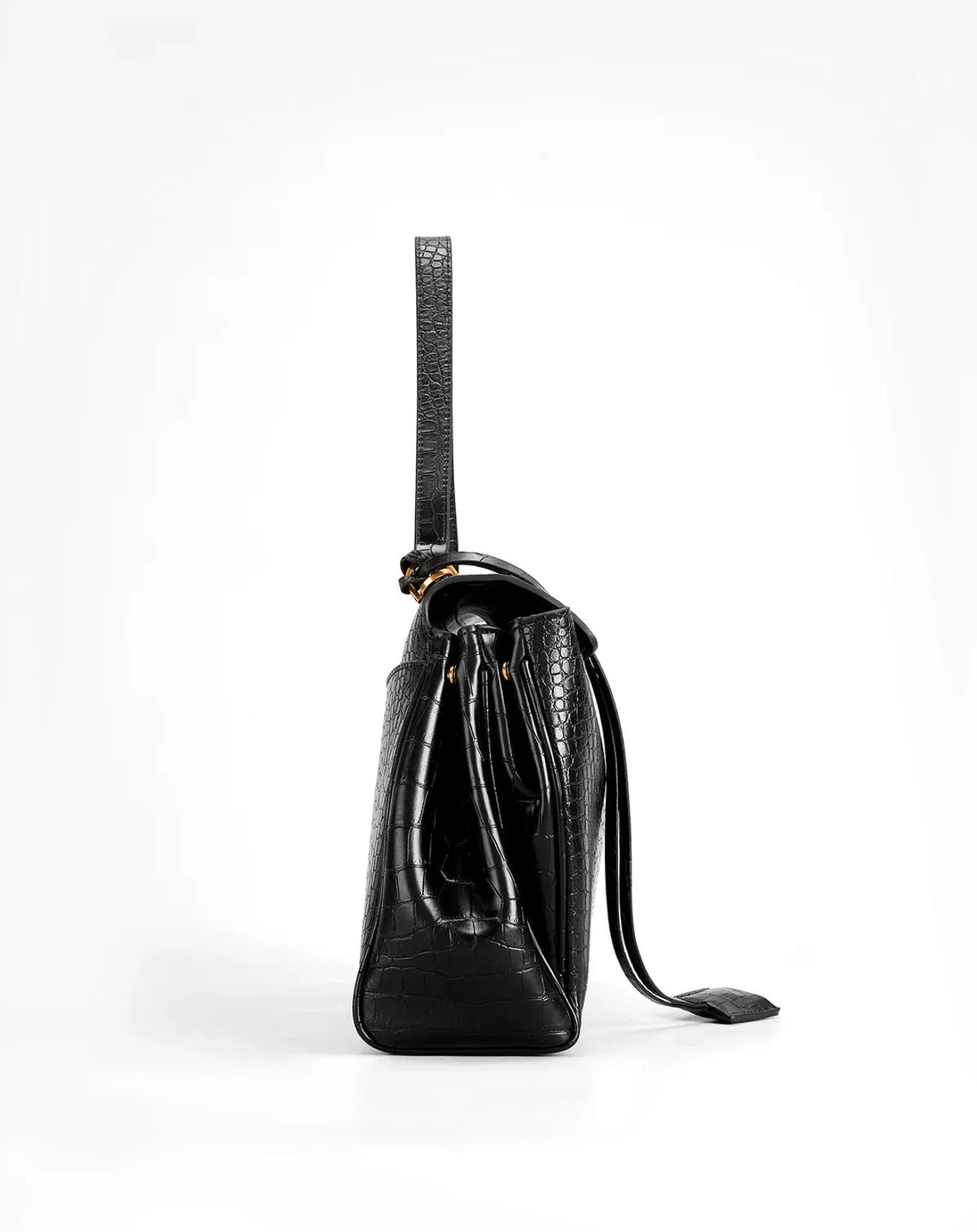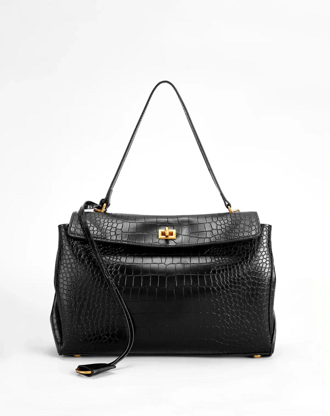 La chiusura a girello in metallo dorato satinato e le ciappe laterali aggiungono un tocco di personalità. Portala a mano con il manico fisso o a spalla grazie alla tracolla regolabile e rimovibile. Ogni dettaglio, dal portachiavi rimovibile alla base rigida con chiodini protettivi, è pensato per unire estetica e praticità.