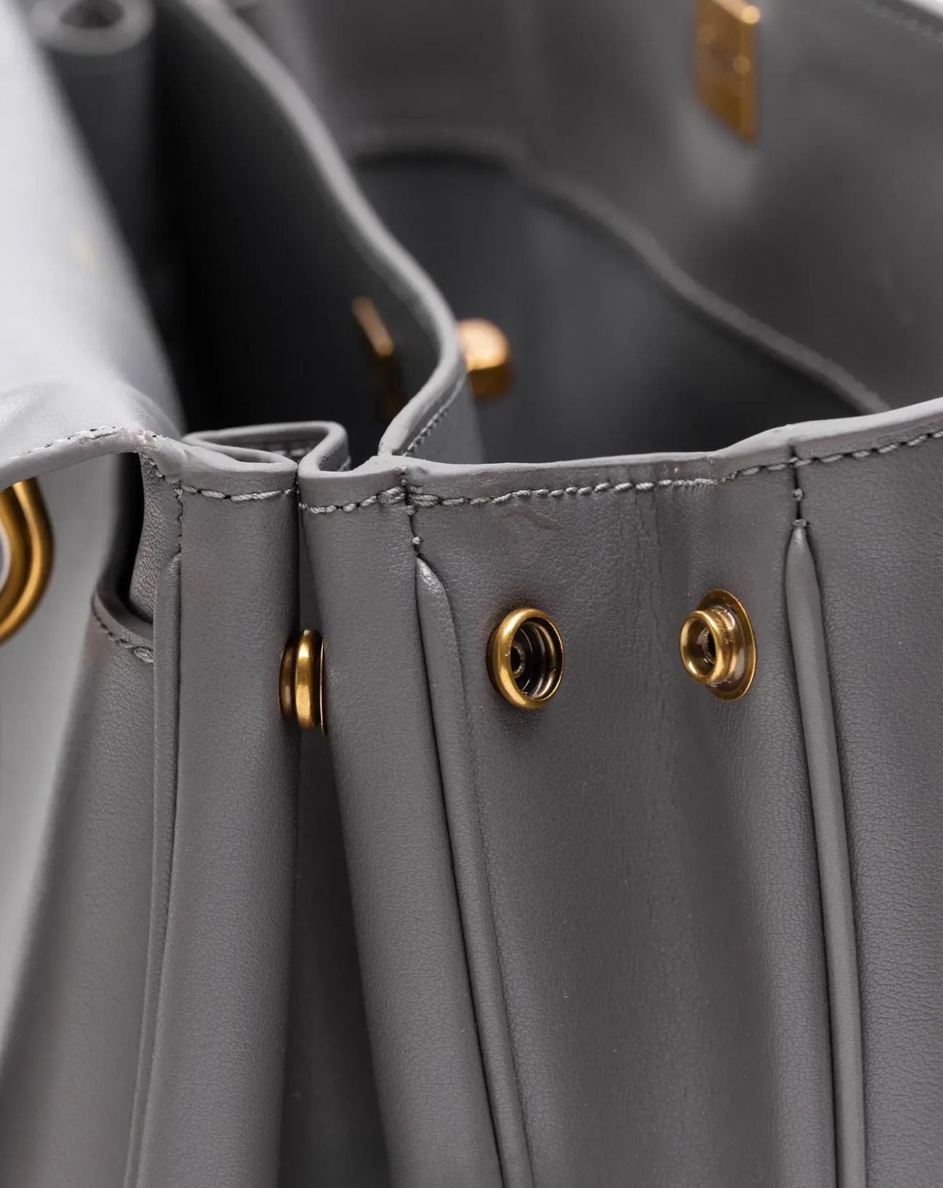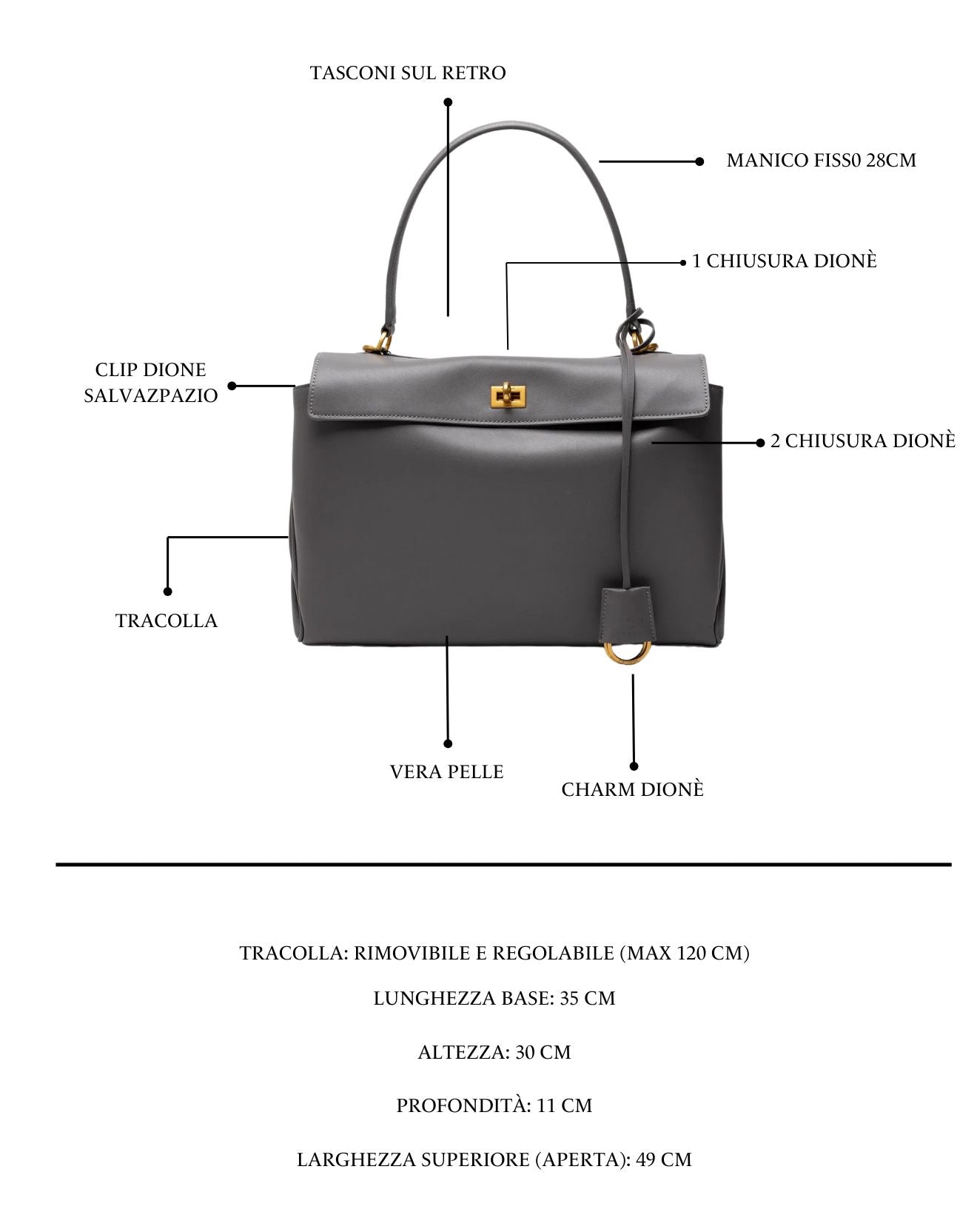 La chiusura a girello in metallo dorato satinato e le ciappe laterali aggiungono un tocco di personalità. Portala a mano con il manico fisso o a spalla grazie alla tracolla regolabile e rimovibile. Ogni dettaglio, dal portachiavi rimovibile alla base rigida con chiodini protettivi, è pensato per unire estetica e praticità.
