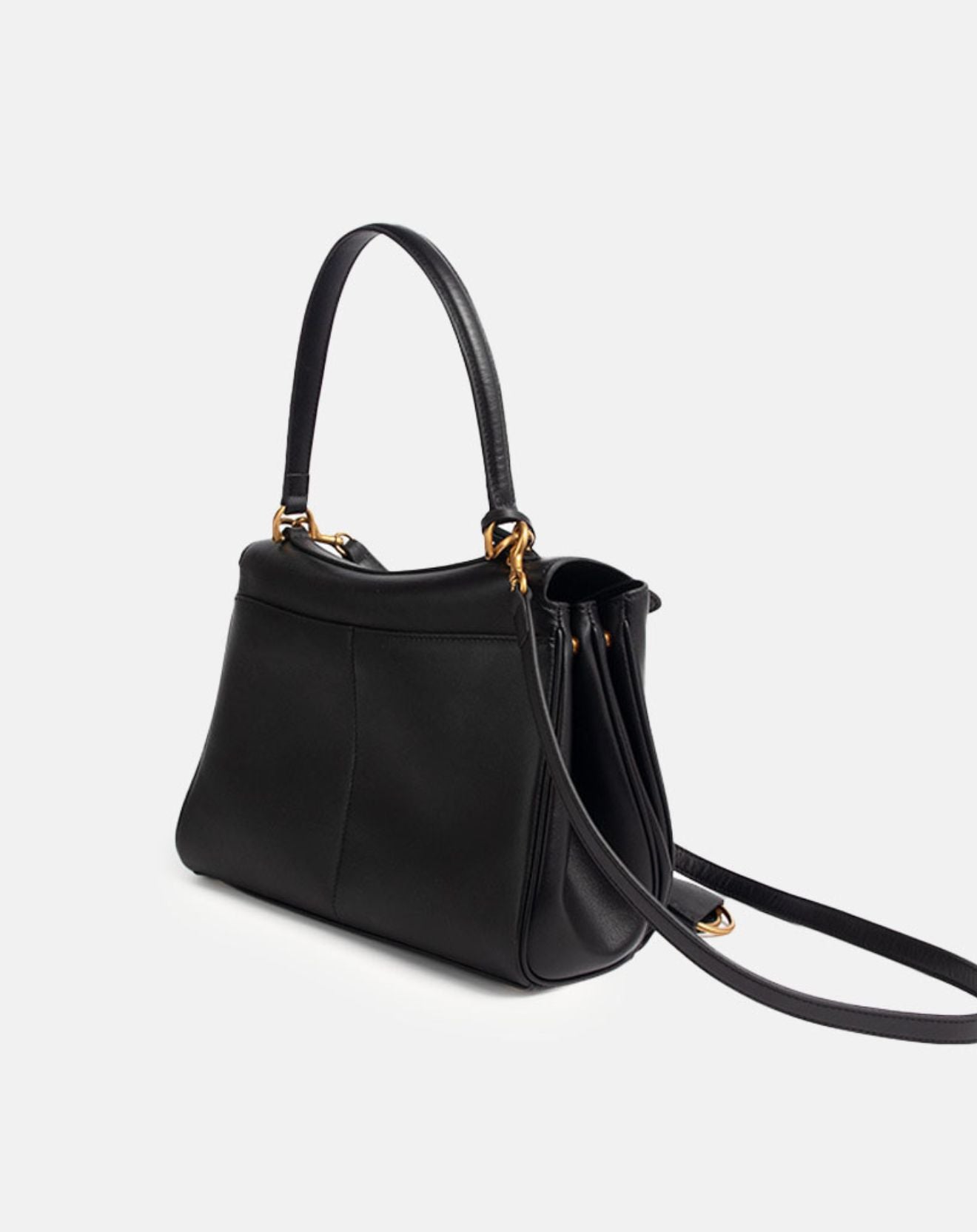 La chiusura a girello in metallo dorato satinato e le ciappe laterali aggiungono un tocco di personalità. Portala a mano con il manico fisso o a spalla grazie alla tracolla regolabile e rimovibile. Ogni dettaglio, dal portachiavi rimovibile alla base rigida con chiodini protettivi, è pensato per unire estetica e praticità.