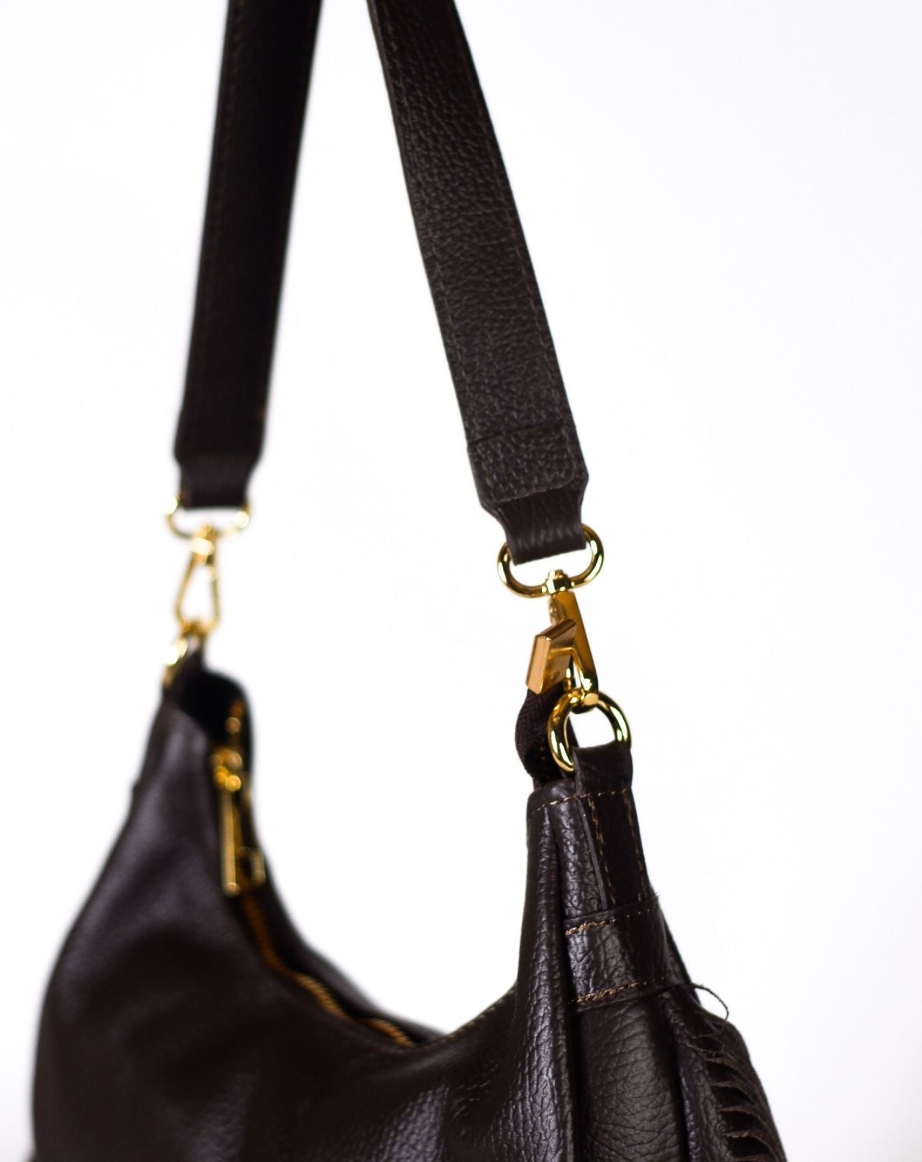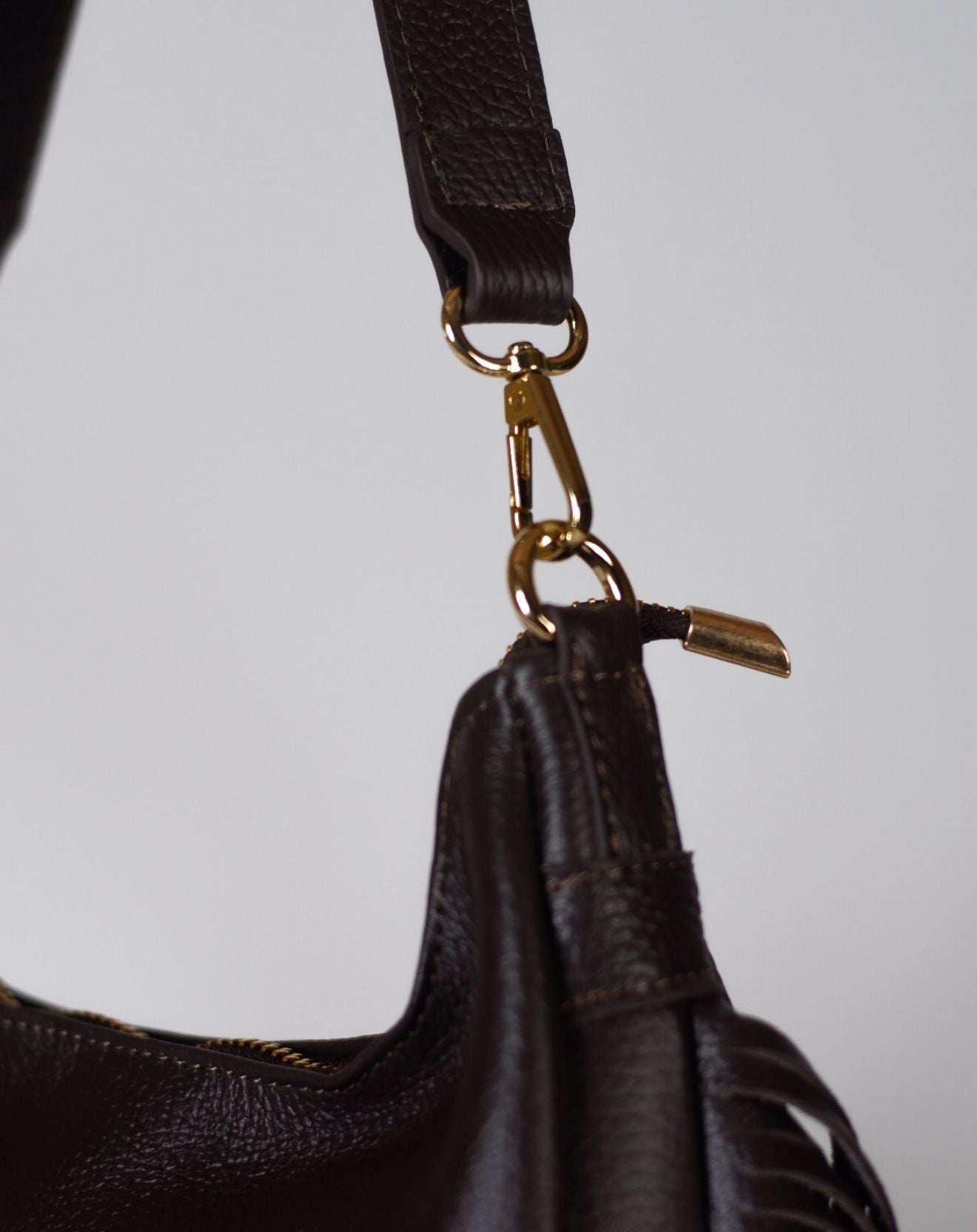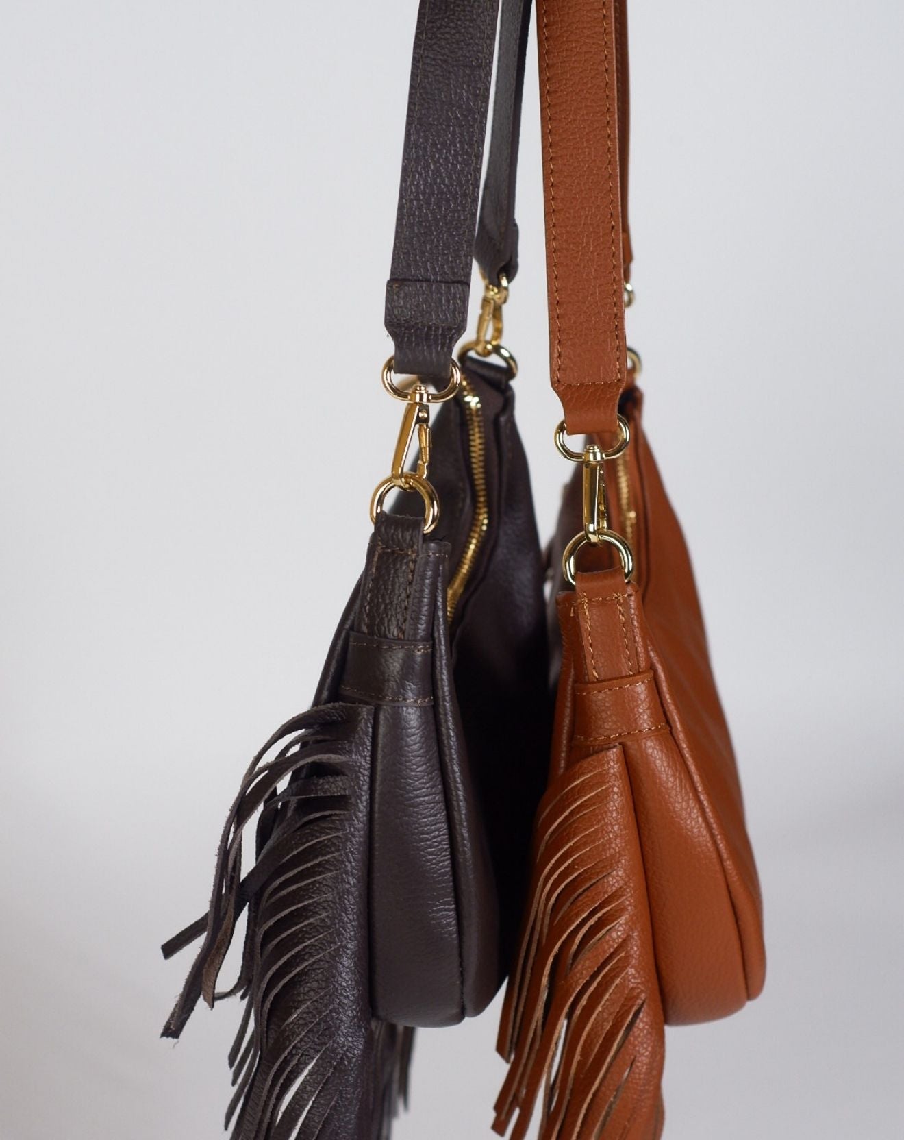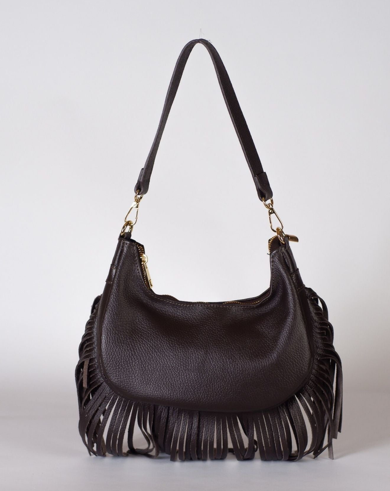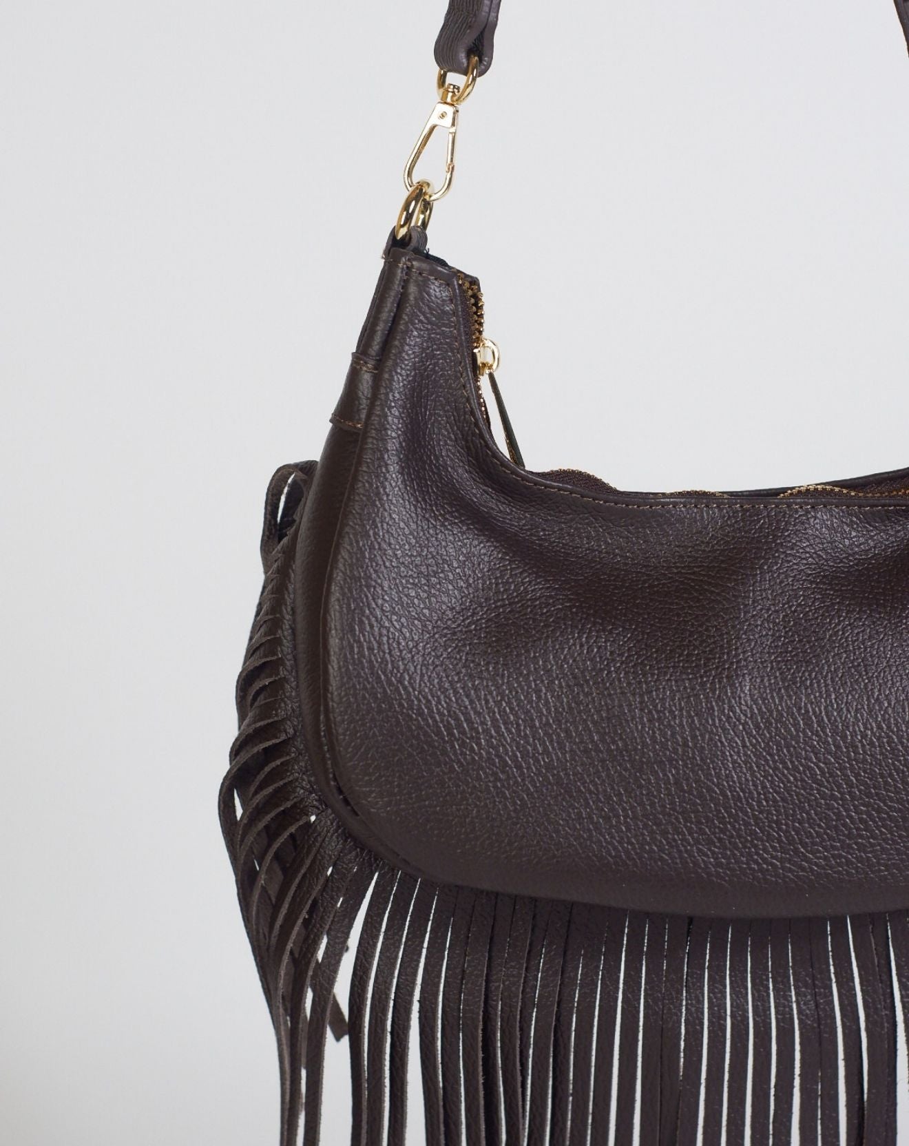 La Klaus Bag in testa di moro rappresenta un equilibrio perfetto tra stile libero e raffinatezza. Questa borsa a tracolla, realizzata in vera pelle italiana, esibisce frange lunghe che le conferiscono un tocco di personalità audace, ideale per la donna moderna che ama distinguersi con grazia.