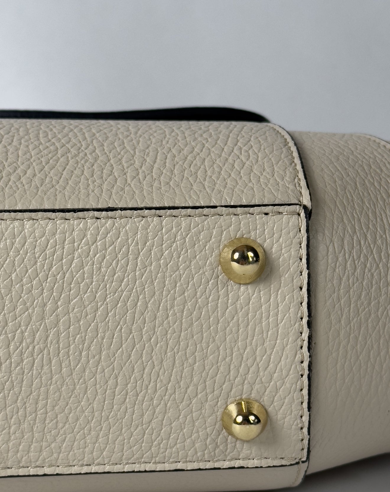 Il manico rigido assicura una portabilità strutturata, mentre la tracolla regolabile aggiunge funzionalità, trasformandola in una pratica crossbody. I piedini protettivi in metallo e la chiusura con zip rifiniscono il design, garantendo durata e sicurezza.