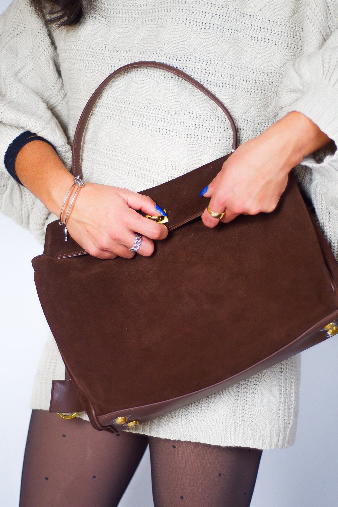 Dentro, due scomparti in vera pelle offrono uno spazio impeccabile, mentre le ciappe laterali ti permettono di adattarne la capienza. Puoi portarla a mano per un look raffinato o con la tracolla regolabile per un’eleganza pratica. Ogni dettaglio è pensato per chi cerca stile e funzionalità senza compromessi.