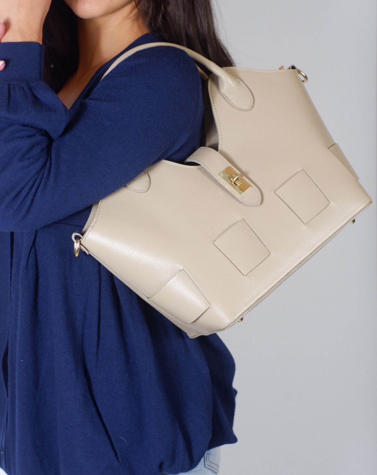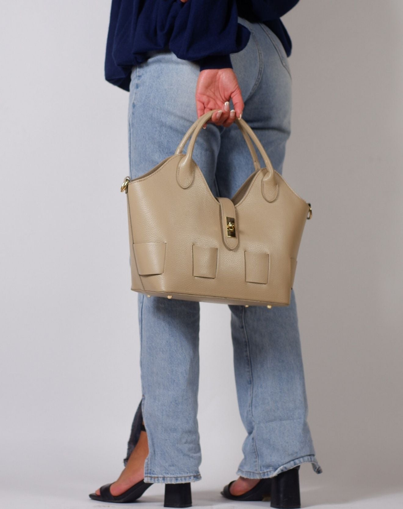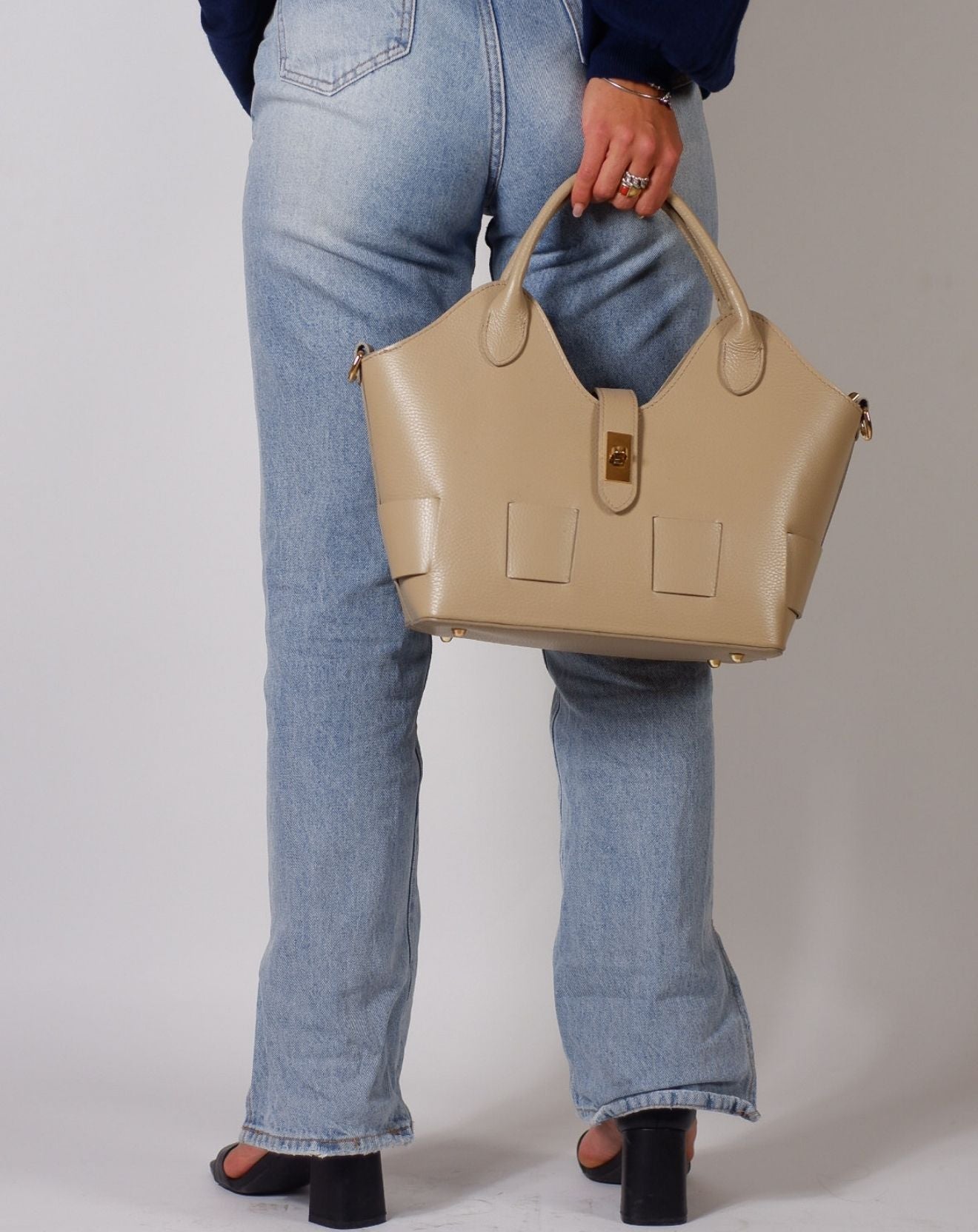Questa borsa a mano Dionè è l'incarnazione della forza e dell'eleganza per la donna moderna che affronta la vita con determinazione. Realizzata in vera pelle beige, offre non solo un aspetto estetico di raffinata bellezza ma anche una resistenza notevole che promette di attraversare le stagioni senza perdere il suo fascino.