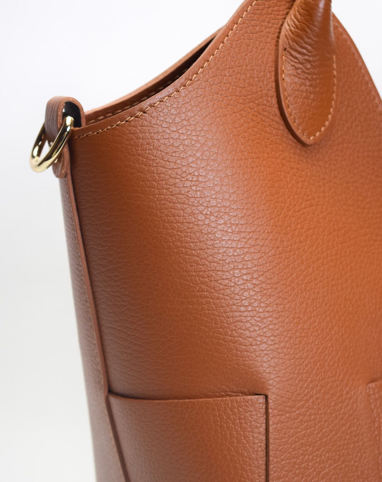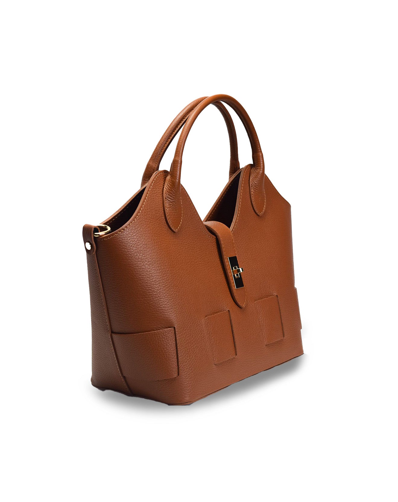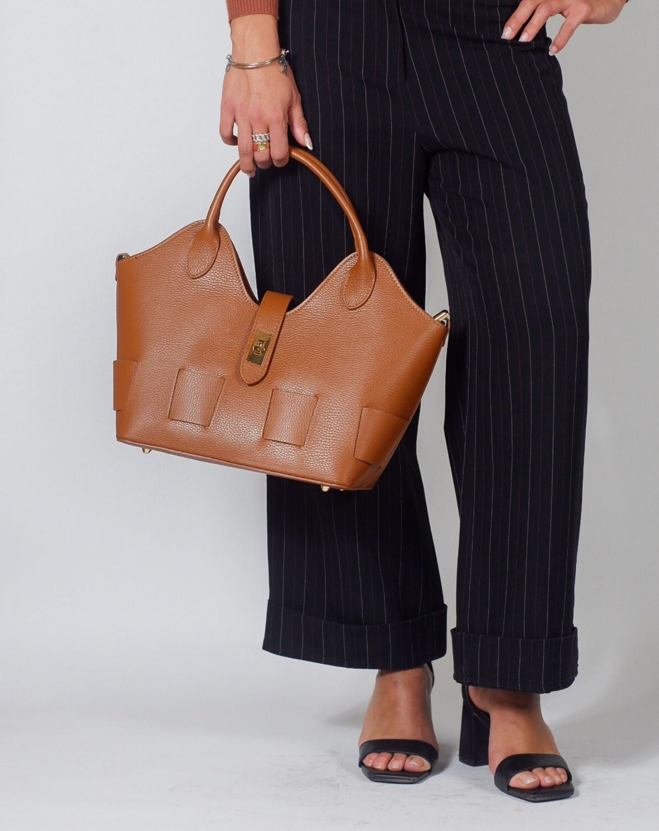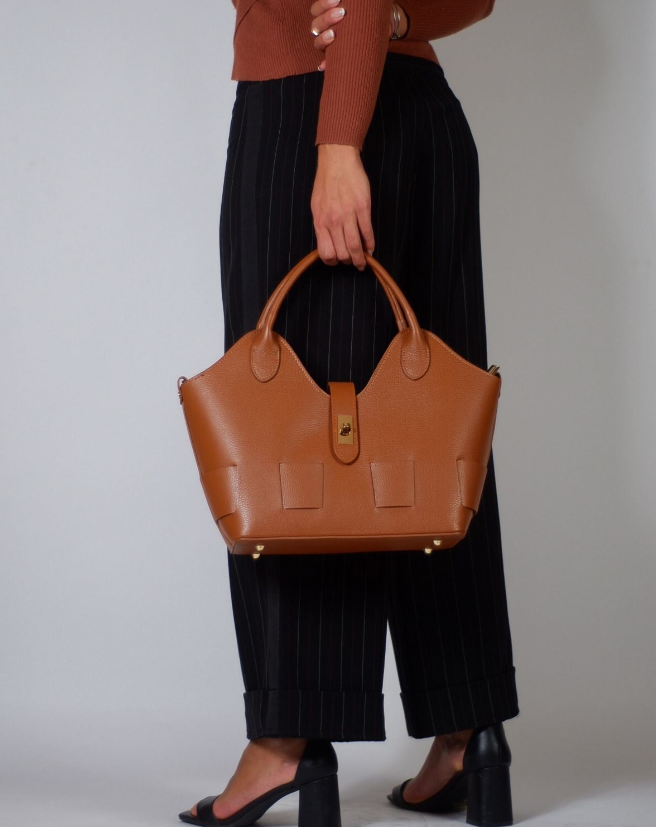 Questa borsa a mano Dionè è l'incarnazione della forza e dell'eleganza per la donna moderna che affronta la vita con determinazione. Realizzata in vera pelle colo cuoio, offre non solo un aspetto estetico di raffinata bellezza ma anche una resistenza notevole che promette di attraversare le stagioni senza perdere il suo fascino.