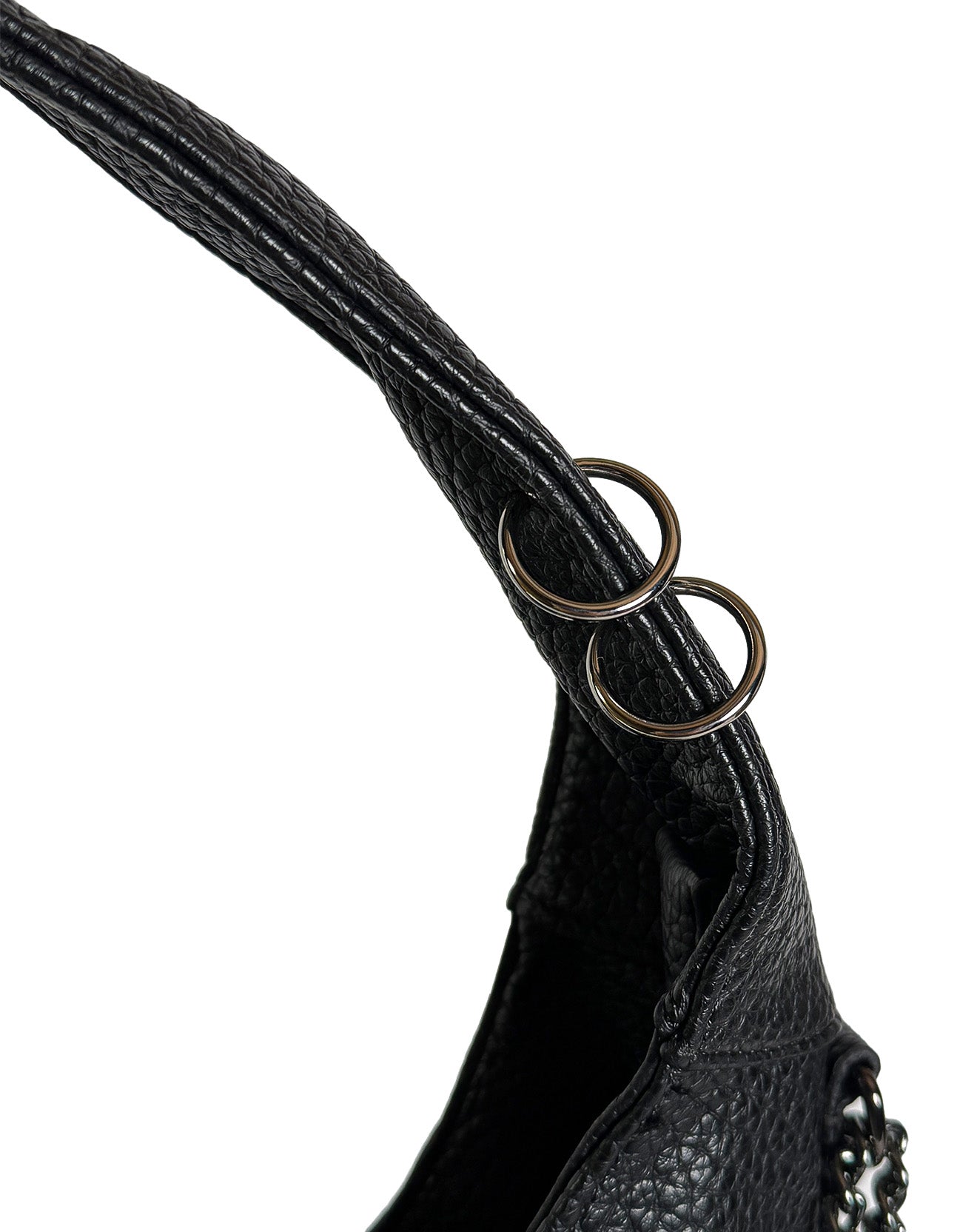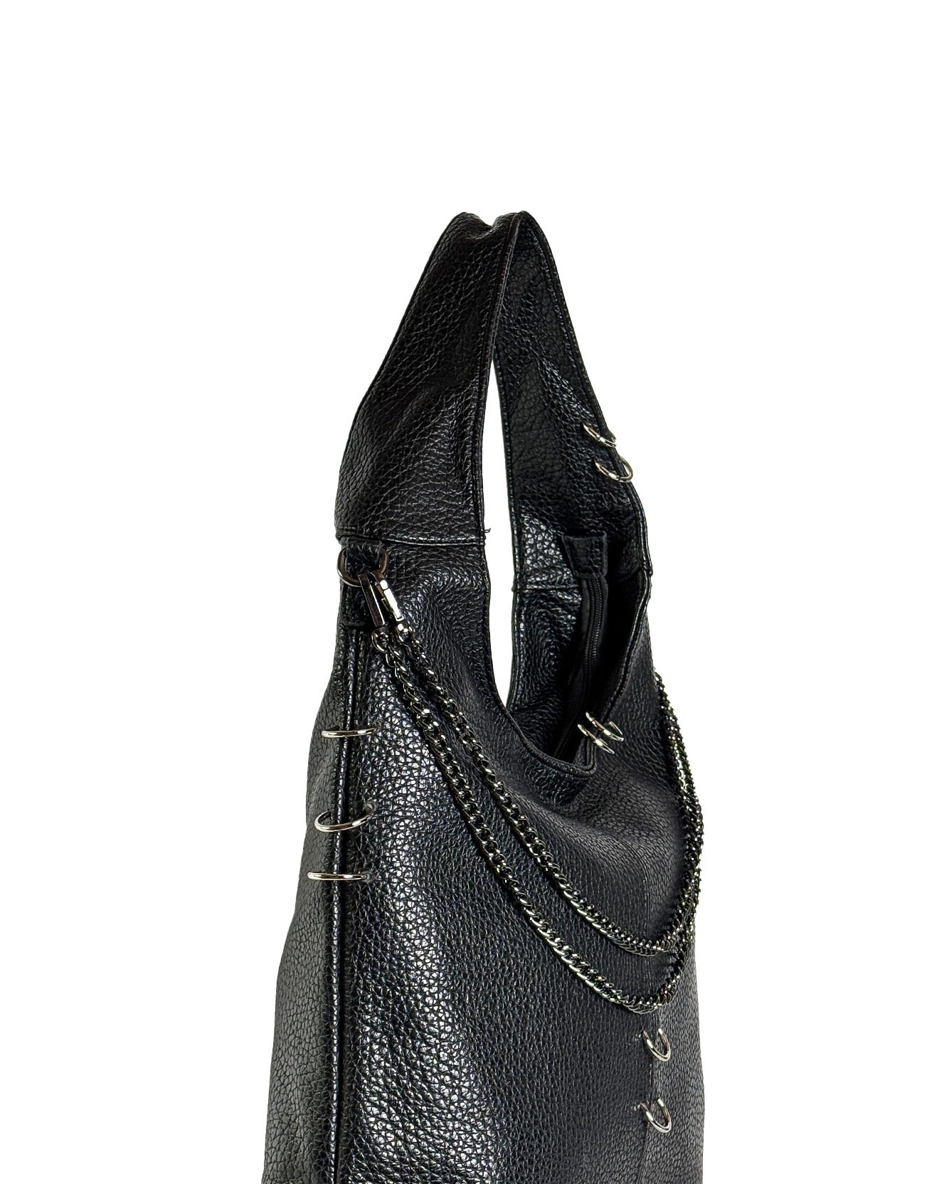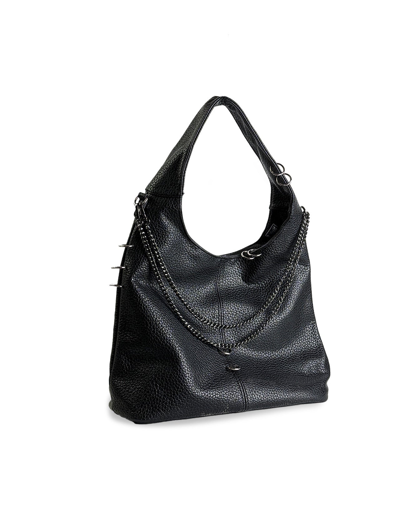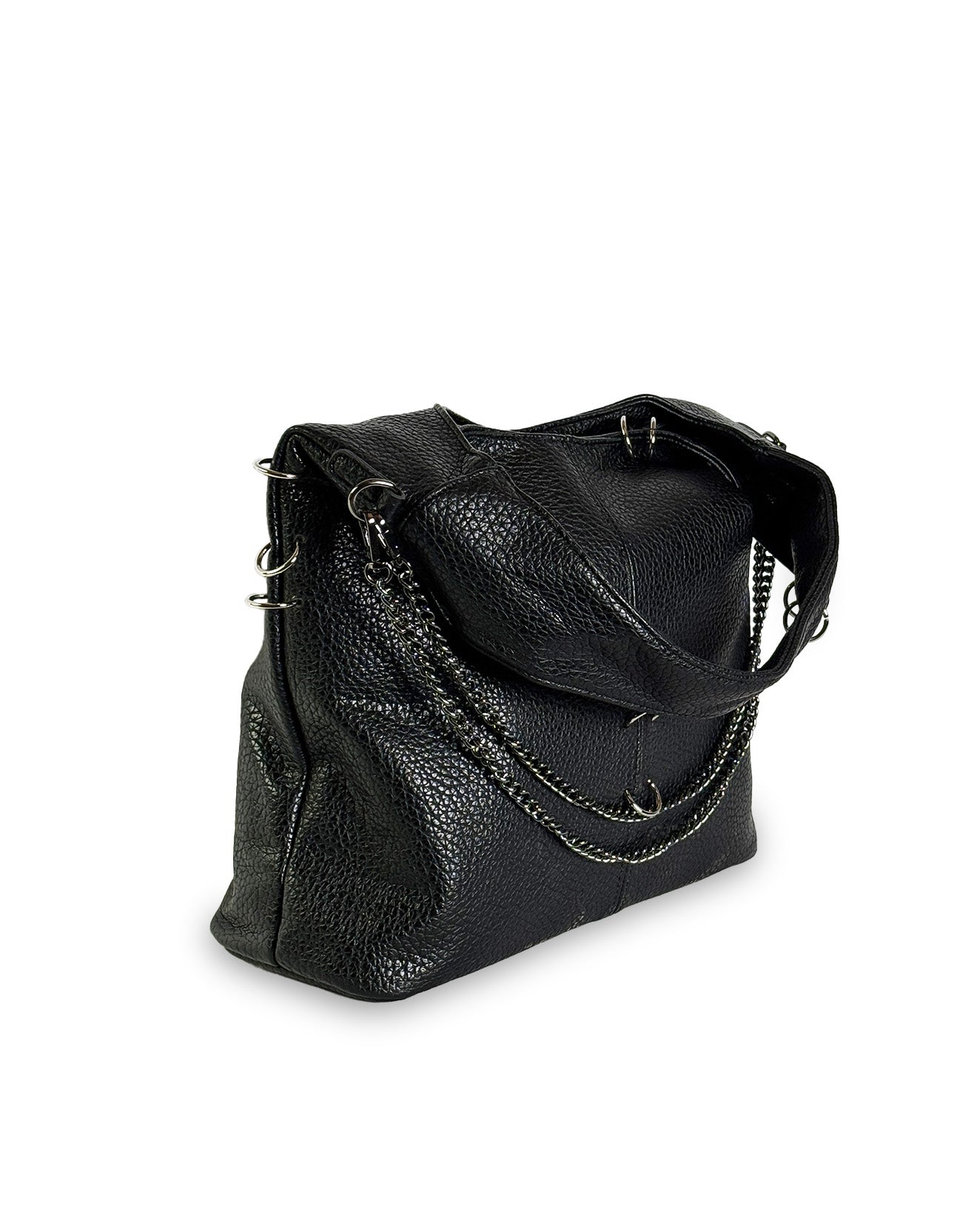 Linee morbide, anima decisa: questa shoulder bag destrutturata è pensata per accompagnarti ovunque, con eleganza spontanea e carattere. Realizzata in ecopelle martellata effetto pelle pieno fiore, è impreziosita da dettagli metallici, anelli decorativi e catene con finitura silver che ne esaltano l'identità.