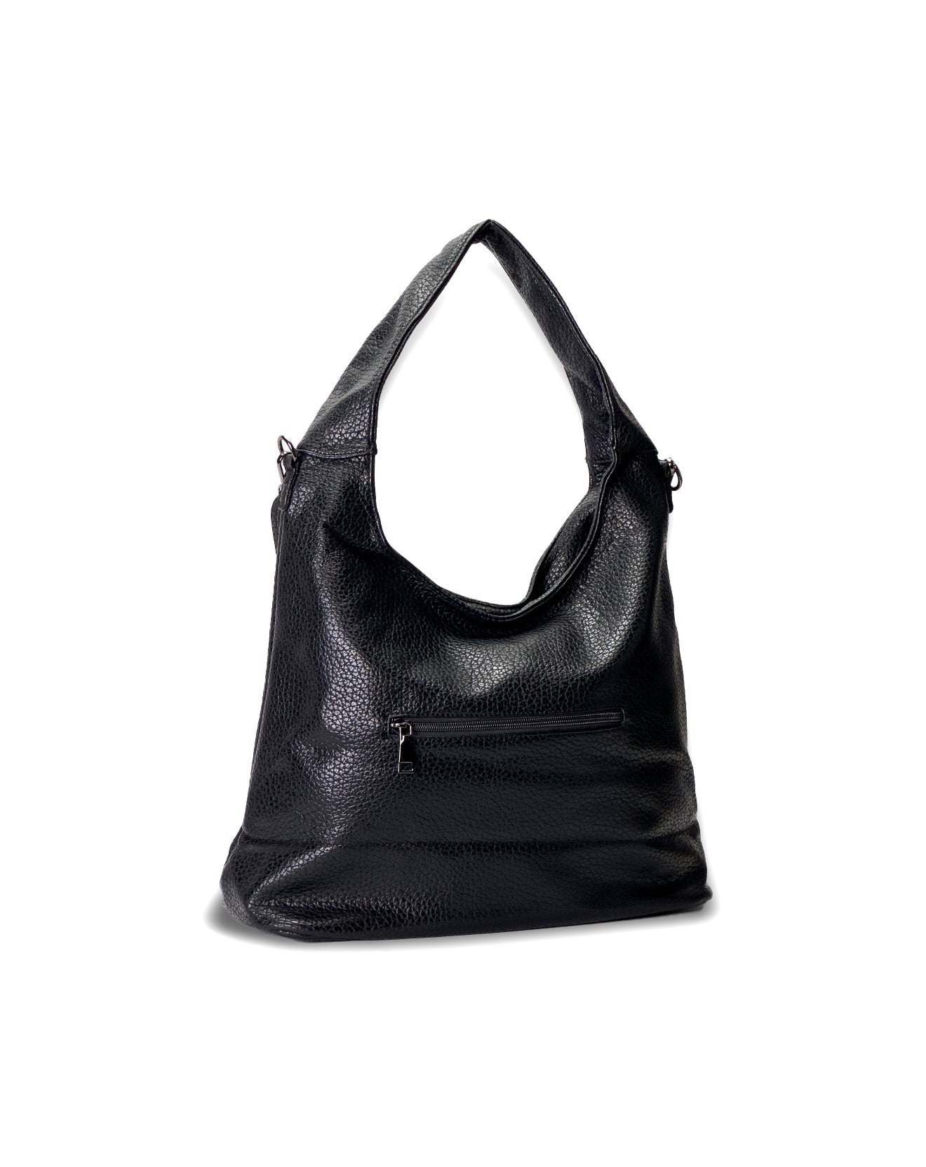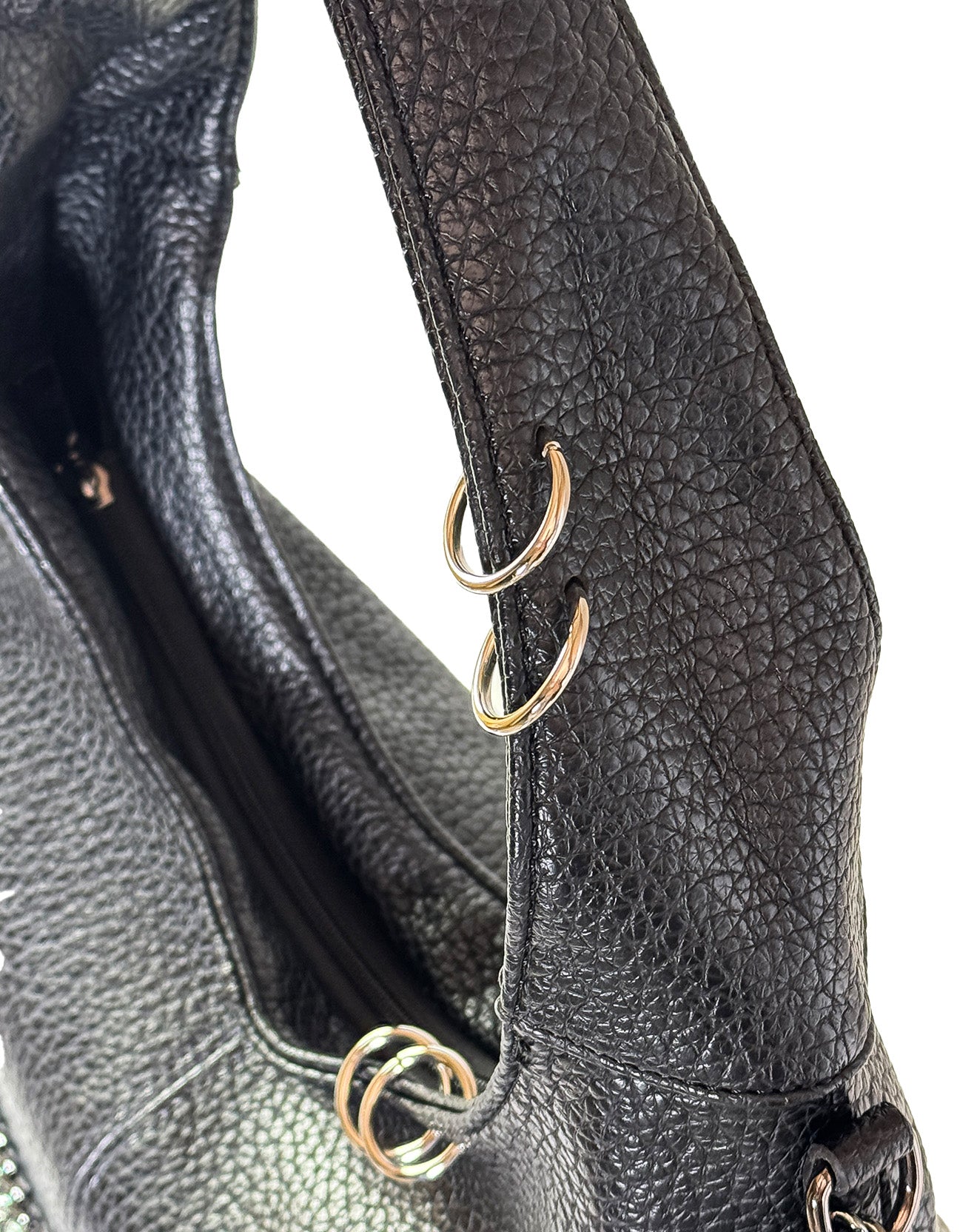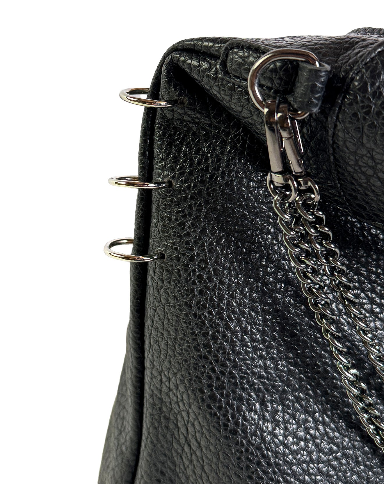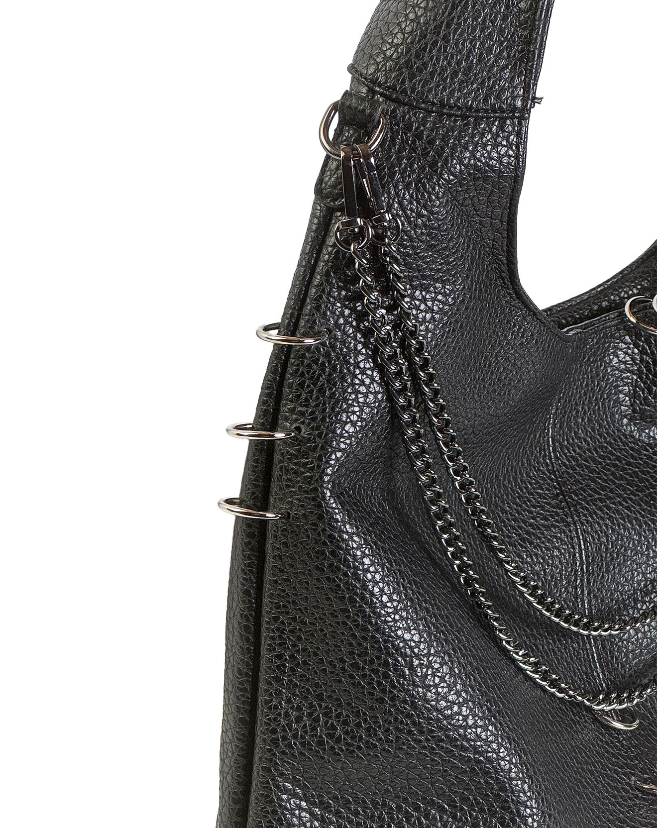Linee morbide, anima decisa: questa shoulder bag destrutturata è pensata per accompagnarti ovunque, con eleganza spontanea e carattere. Realizzata in ecopelle martellata effetto pelle pieno fiore, è impreziosita da dettagli metallici, anelli decorativi e catene con finitura silver che ne esaltano l'identità.