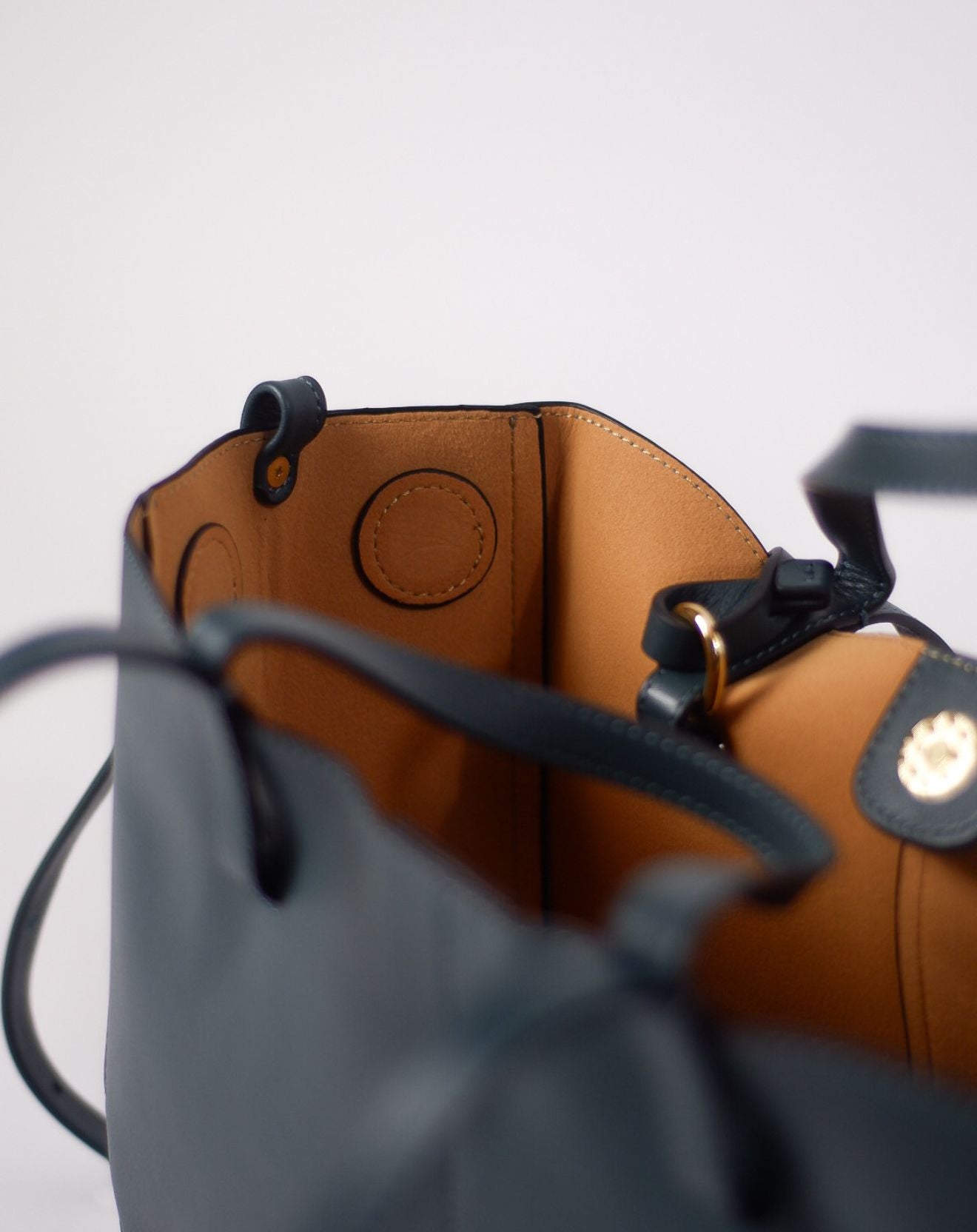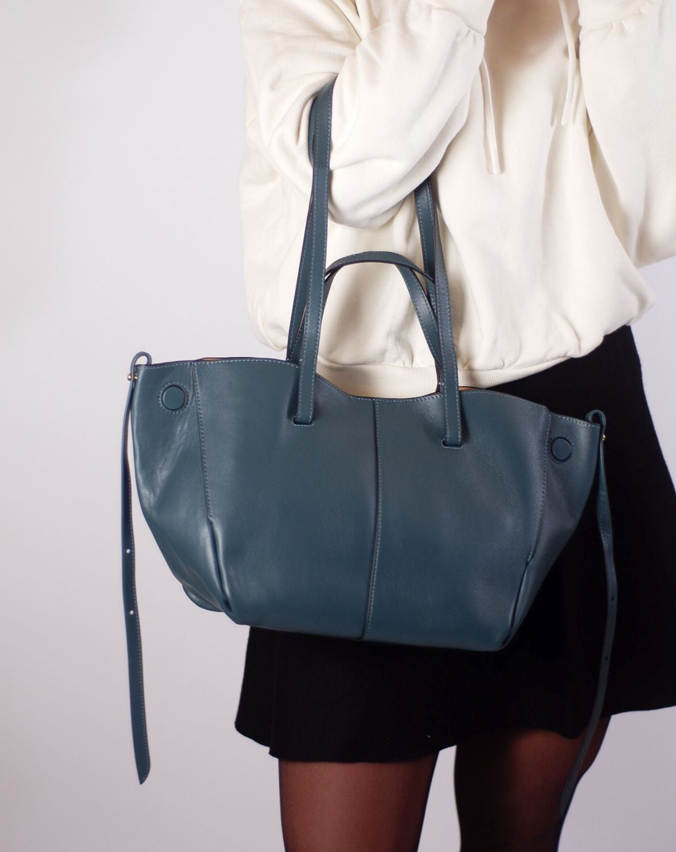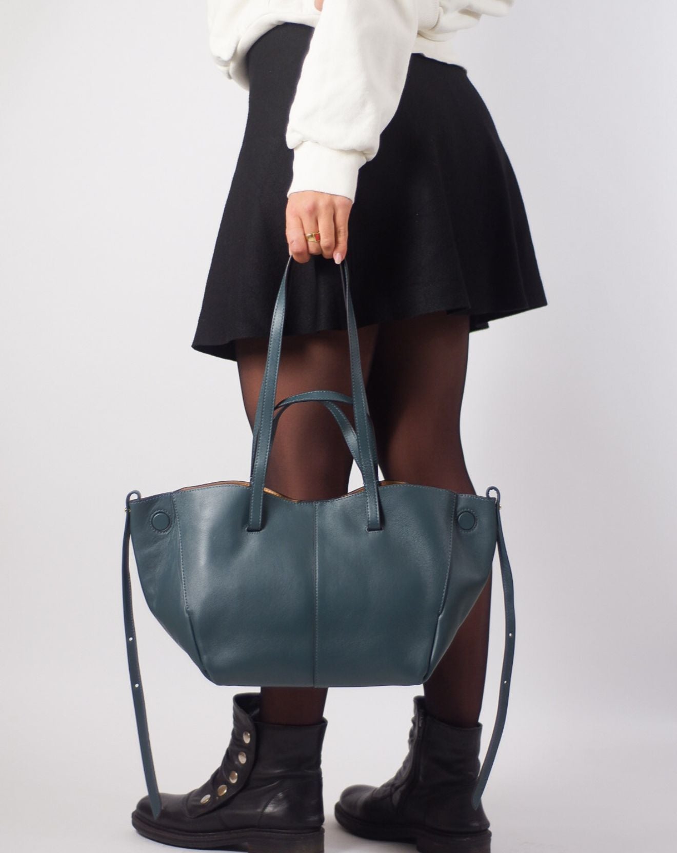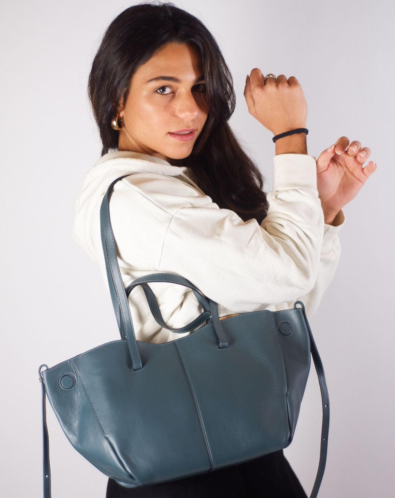 Immagina una borsa che si adatta al ritmo della tua giornata con un semplice tocco: ecco a te la nostra tote bag in vera pelle! Questa meraviglia di stile può trasformarsi da una spaziosa "barchetta" per quei giorni pieni di impegni, a una forma più compatta per un look serale elegante.