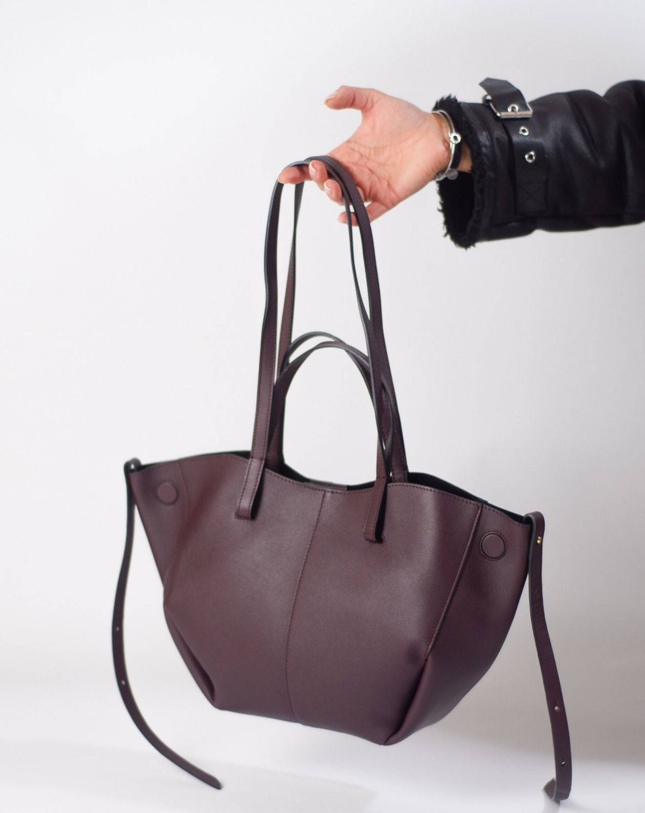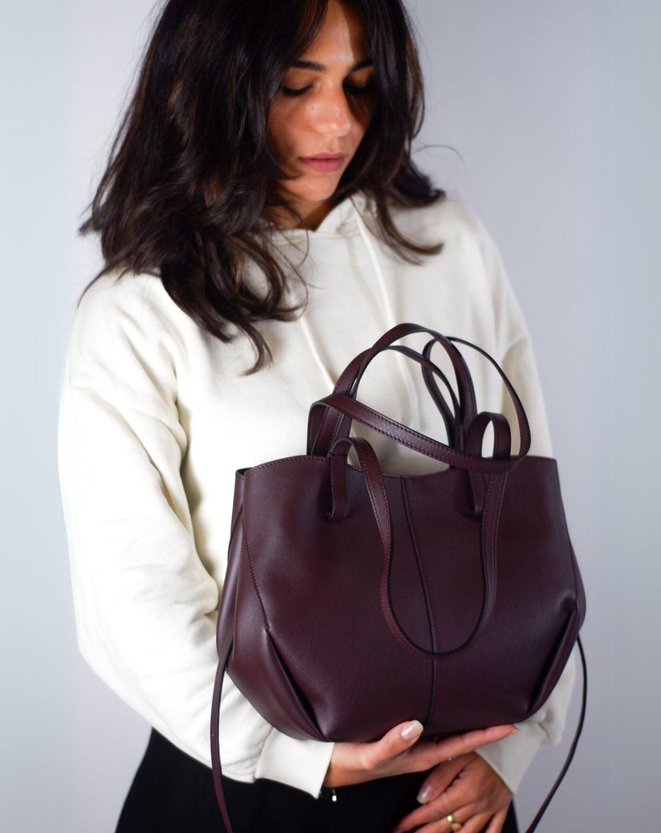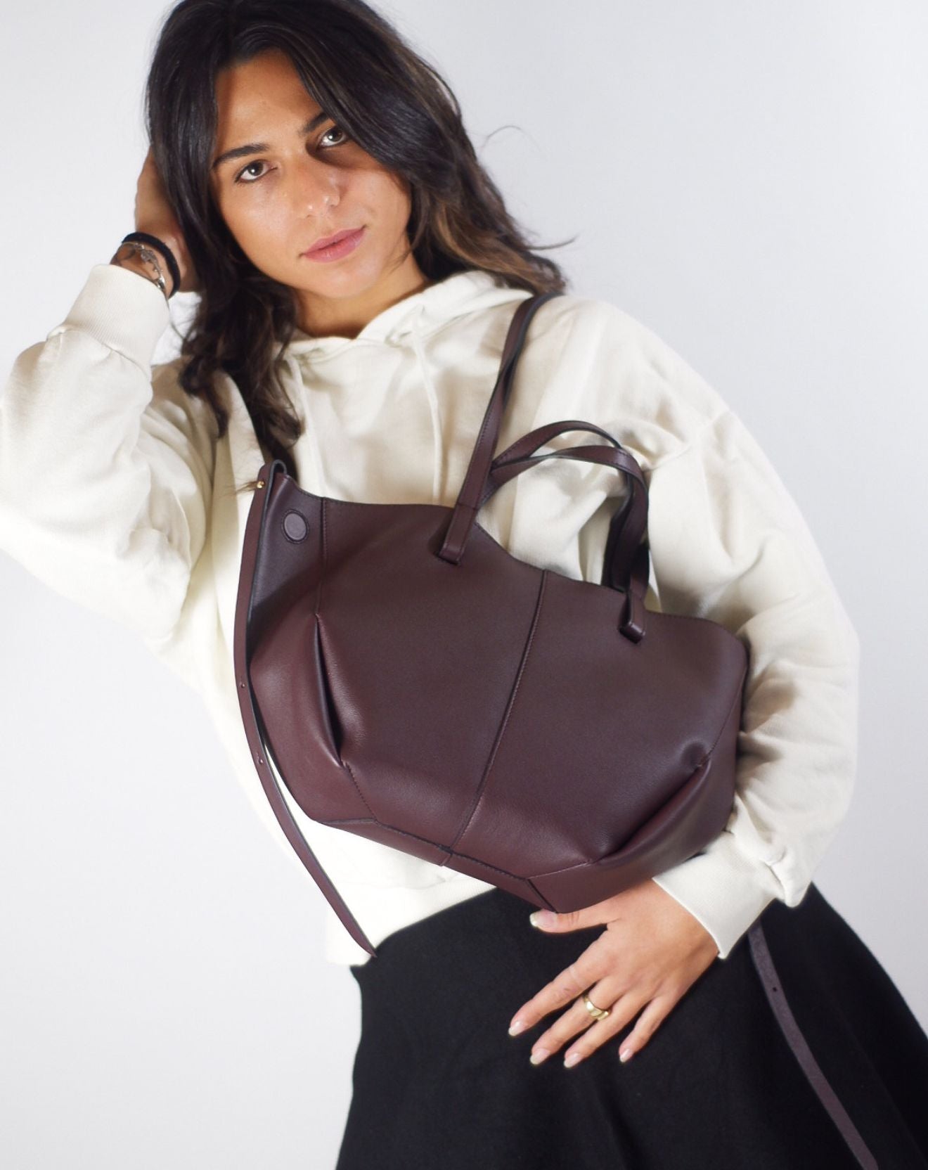 Immagina una borsa che si adatta al ritmo della tua giornata con un semplice tocco: ecco a te la nostra tote bag in vera pelle! Questa meraviglia di stile può trasformarsi da una spaziosa "barchetta" per quei giorni pieni di impegni, a una forma più compatta per un look serale elegante.