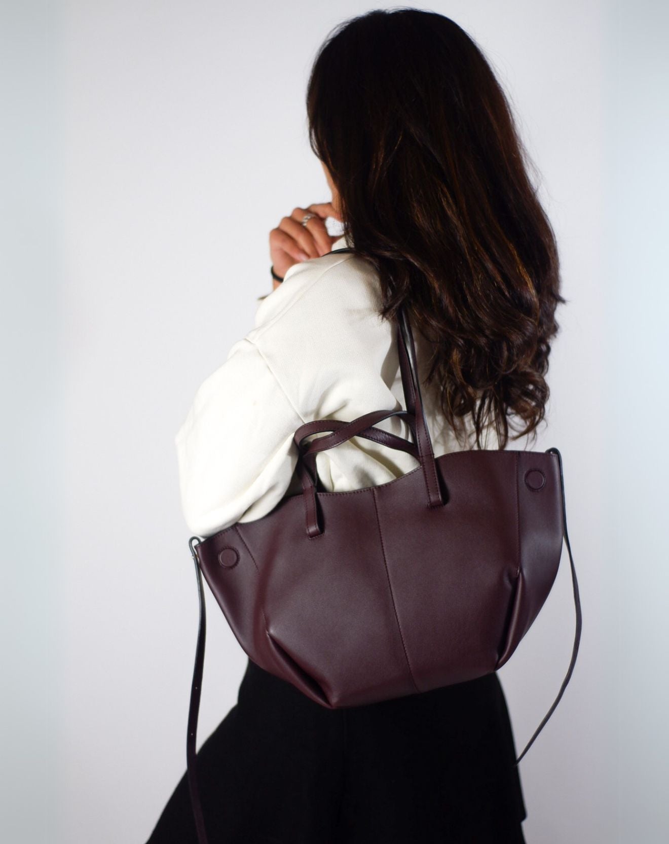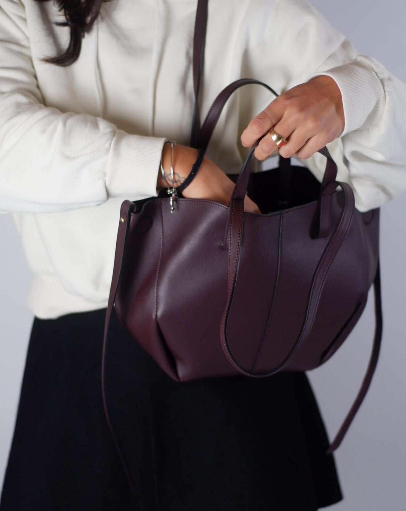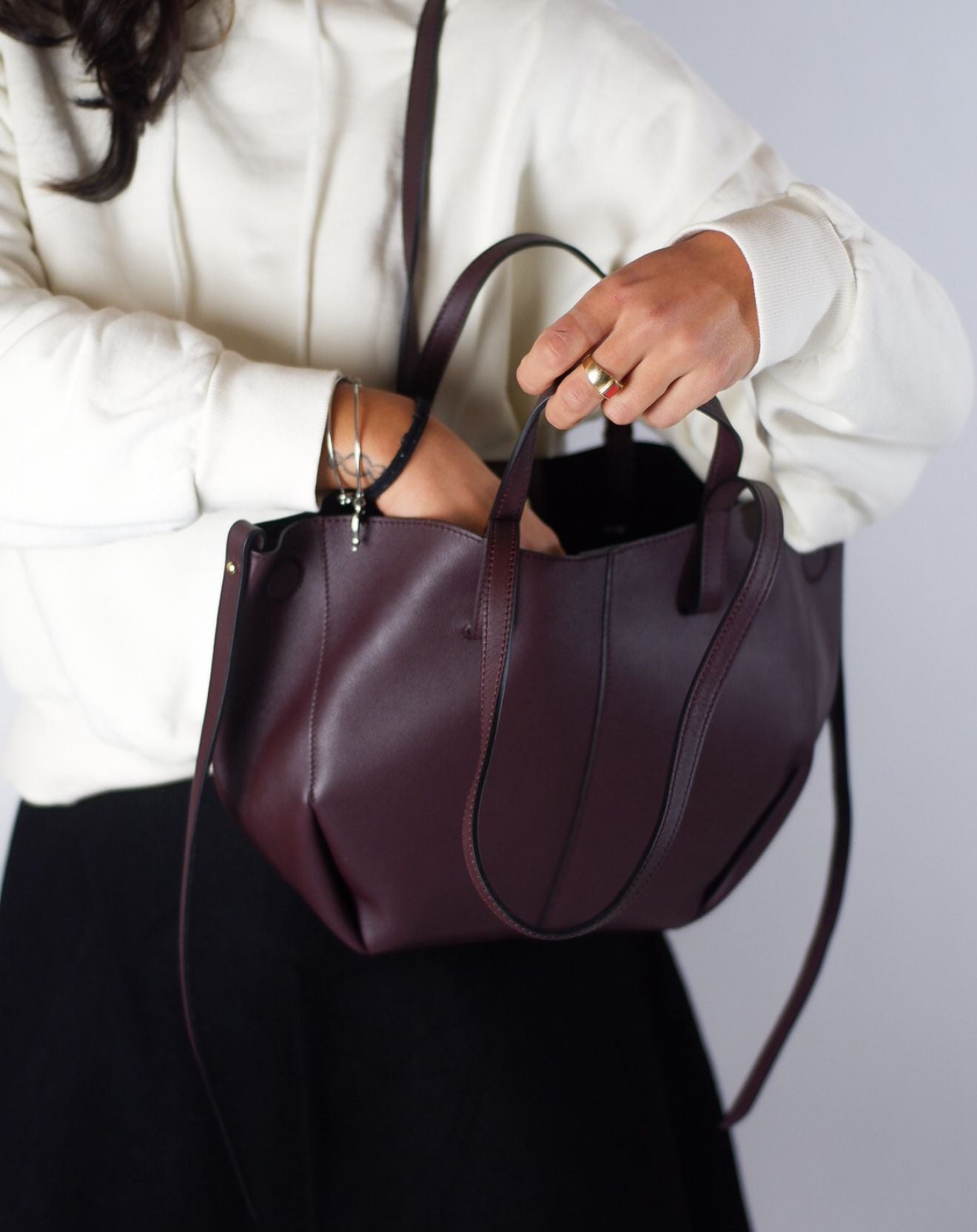 Immagina una borsa che si adatta al ritmo della tua giornata con un semplice tocco: ecco a te la nostra tote bag in vera pelle! Questa meraviglia di stile può trasformarsi da una spaziosa "barchetta" per quei giorni pieni di impegni, a una forma più compatta per un look serale elegante.